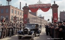 В дальнейшем, авторы индустриализации меньше стеснялись истории происхождения "передовых" советских заводов. Вот как пишет о строительстве Горьковского автомобильного завода Томас П. Хьюз — профессор кафедры Эндрю Меллона в Пенсильванском университете и профессор кафедры Торстена Алтина в Королевском технологическом институте в Стокгольме, Швеция.